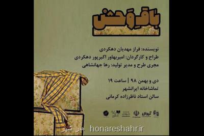 امیربهاور اكبرپور دهكردی كارگردان نمایش «باق وحش» كه مقرر است از ساعت ۱۹ روز دوشنبه ۹ دی اجرای عمومی خودرا در سالن ناظرزاده كرمانی تماشاخانه ایرانشهر آغاز كند، درباره شكل و شیوه تولید و اجرای این اثر نمایشی به خبرنگار مهر اظهار داشت: نمایشنامه، كارگردانی، بازیگری و طراحی نمایش «باق وحش» همچون تجربیات گذشته مان نظیر نمایش «آنشرلی با موهای خیلی قرمز» به صورت گروهی شكل گرفته است.